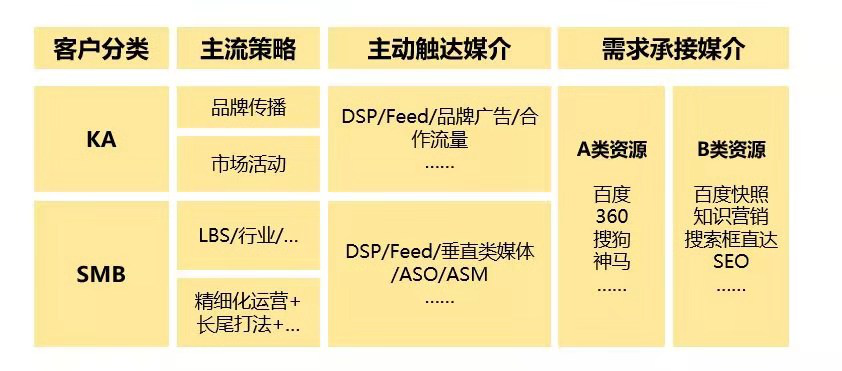 SMB(中?。╊惪蛻簦滓蝿?wù)是完成變現(xiàn),營銷轉(zhuǎn)化。針對LBS點位、以及行業(yè)屬性分析投放,在針對性投放的基礎(chǔ)上來做精細(xì)化運營,選擇DSP、信息流、垂直類媒體、ASO、ASM等媒體被動觸達(dá),搜索引擎等媒體來承接目標(biāo)人群的需求。