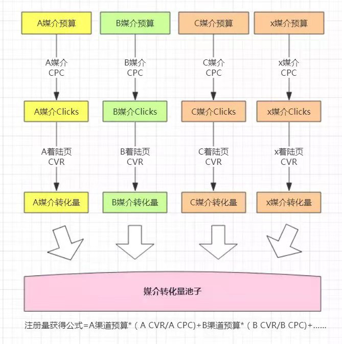 也就是說轉(zhuǎn)化量與各類媒介的預(yù)算、各類媒介的點擊價格CPC、各類媒介的轉(zhuǎn)化率CVR有關(guān)。計算公式:媒介轉(zhuǎn)化=A渠道預(yù)算*(A CVR/A CPC)+B渠道預(yù)算*(B CVR/B CPC)+C渠道預(yù)算*(C CVR/C CPC)+.....