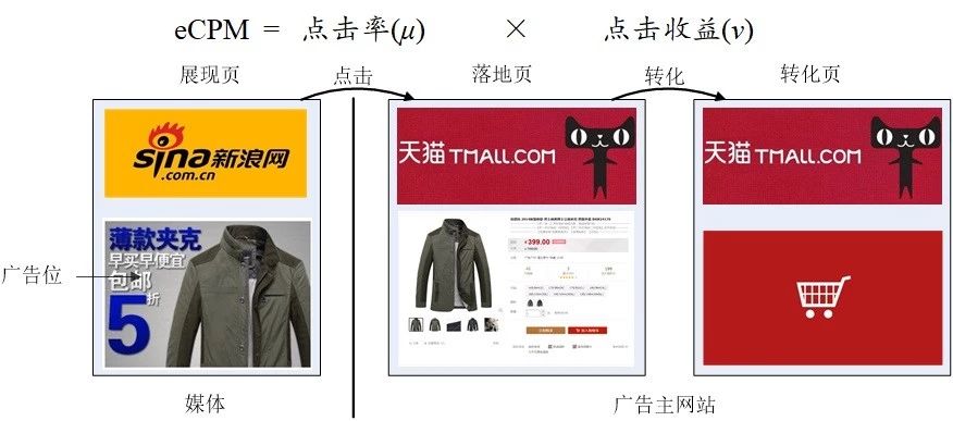 eCPM具體怎么算呢?我們把廣告產(chǎn)生效果的過程分解,就清楚了。如下圖所示,一部分用戶看到廣告后會點擊它,這個比例是點擊率μ;而點擊用戶又可能產(chǎn)生轉化,為客戶帶來平均點擊收益v。顯然,只要分別算出這兩個量,把它們乘起來就是eCPM。