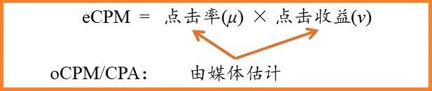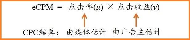 什么是價高者?就是給本次展示帶來的最大收益的那則廣告。因為要在廣告投出去前的一瞬間做決策,這個展示收益是預估的,叫“千次展示期望收益(expected Cost per Mille, eCPM)”,由于單次展示收益太小,為了方便習慣上乘個一千。我們說計算廣告,核心就是算這個eCPM,找出價高者。