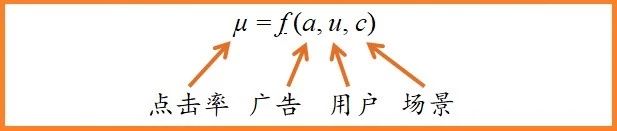 客戶給了點擊收益,該算點擊率了。某次廣告展示的點擊率,跟什么因素有關呢?一是用戶,不同用戶的興趣與需求不同,適合的廣告也不同;二是場景,也就是用戶當下正在做什么,毫不相干的廣告效果自然不好。也就是說,點擊率是廣告、用戶和場景三者的函數(shù)。