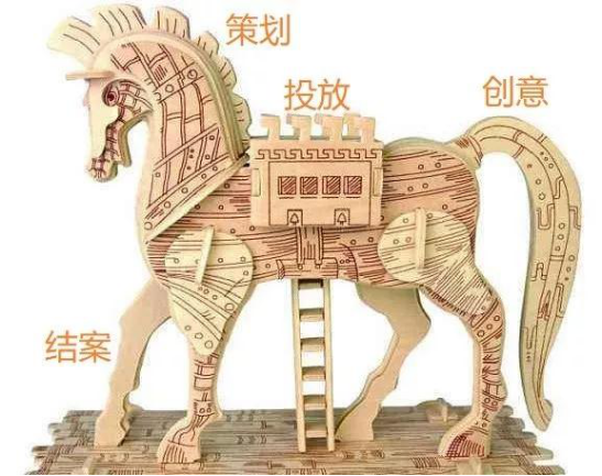 傳統(tǒng)廣告把廣告活動的執(zhí)行流程,分為策劃、創(chuàng)意、投放和結案幾個部分,譬如下面特洛伊木馬的頭尾身足。只是“投放”這個馬身子,因為傳統(tǒng)媒體既無法歸因,也無法個性化,只好當個黑盒子不求甚解。