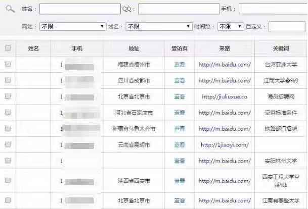 目前網(wǎng)上有很多提供此類服務(wù)的工具,按單條手機號碼或包月的形式收費。付款安裝代碼后,會給你一個后臺。當(dāng)有訪客點擊網(wǎng)站后,會立馬獲取用戶的信息。如下圖所示,除了電話號碼,包括搜索詞等信息都可以知道。