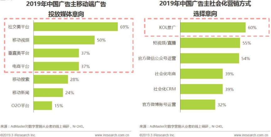 其中KOL原生社交平臺(tái)的廣告投放意向達(dá)到69%,在其他社會(huì)化營銷方式選擇意向調(diào)查中