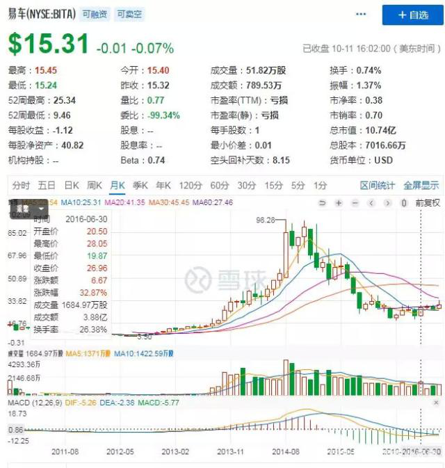 易車網(wǎng)是一家汽車資訊平臺,于2010年在美國完成上市,IPO時的股價是12美元/股,市值4.71億美元;如今9年過去了,易車網(wǎng)的股價為15.31美元/股,市值為10.74億美元。