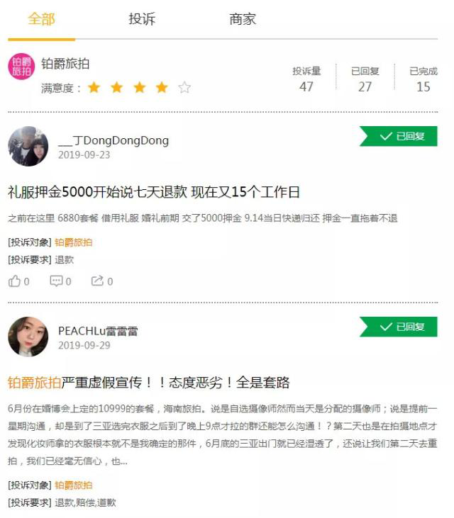 對于鉑爵旅拍的服務(wù)質(zhì)量也不容樂觀。根據(jù)黑貓投訴平臺上的信息,在47條投訴信息中,虛假宣傳、退款難成為用戶投訴最多的關(guān)鍵詞,這也能夠側(cè)面反映出鉑爵旅拍洗腦廣告背后的真實服務(wù)水平。