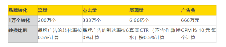 品牌廣告的投放,如果要達(dá)到1萬個轉(zhuǎn)化,大概要200萬個流量(0.5%的轉(zhuǎn)化率對品牌廣告來說,已經(jīng)不算低)。