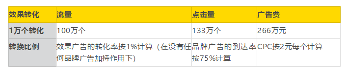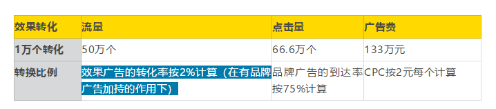 在這種情況下,我們假設(shè)品牌廣告和效果廣告都要達(dá)到1萬個轉(zhuǎn)化。