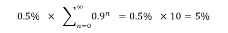 如果起始月份的轉(zhuǎn)化率是0.5%,月衰減率10%,那么品牌廣告的轉(zhuǎn)化率是多少呢?把后續(xù)月份加起來就好。0.5% + 0.5% x 90% + 0.5% x 90%^2 + 0.5% x 90%^3 + …… 這是一個數(shù)學(xué)中的指數(shù)求和公式。最后的結(jié)果是5%。