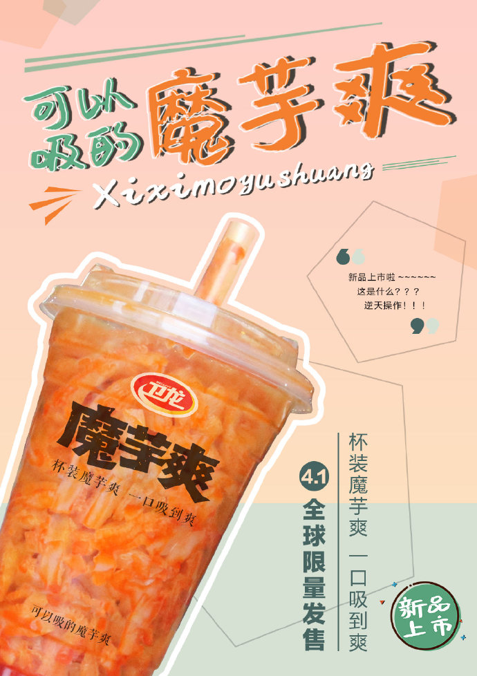因為愚人節(jié)的節(jié)日特性,這一天網(wǎng)友們格外包容,品牌們可以更是放飛自我,玩出花樣。出周邊、搞跨界、黑科技……愚人節(jié)這一天,只有網(wǎng)友想不到的,沒有品牌做不到的。經(jīng)過幾屆愚人節(jié)的歷練,品牌們更是將“憑空想象”用得爐火純青,反而是我等吃瓜群眾越來越難辨真假了。衛(wèi)龍可以吸的魔芋爽 & 超大包魔芋爽。新品上市,全球限量首發(fā)!