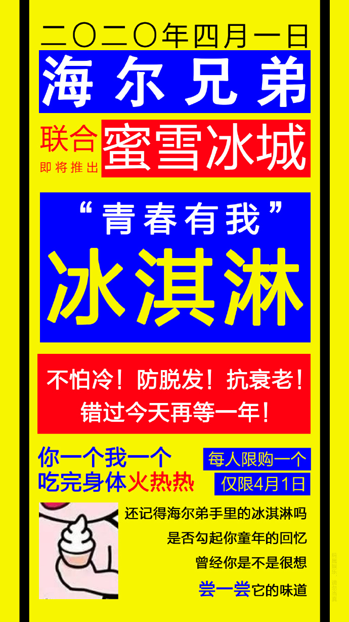 淇淋嗎?吃了它,就能像海爾兄弟一樣,不懼嚴寒!不掉頭發(fā)!青春永駐!走過路過不要錯過,