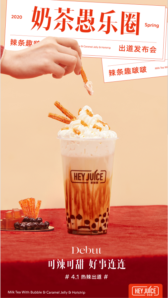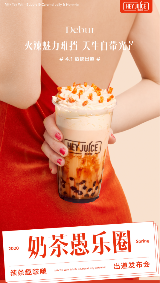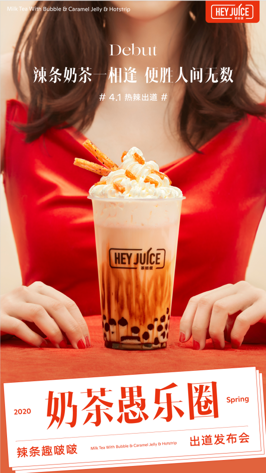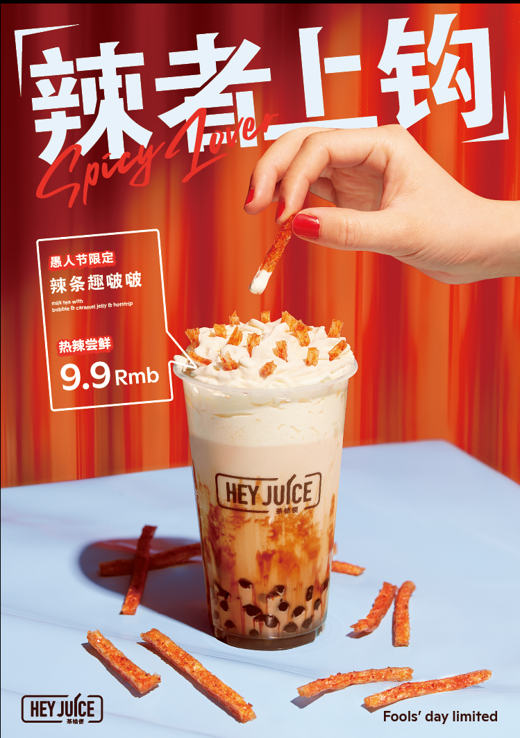 這個海報設(shè)計師一定是得到了椰樹椰汁老板的真?zhèn)鳎y eyes!HEYJUICE茶桔便推出愚人節(jié)限定辣條奶茶,你愛…了嗎?