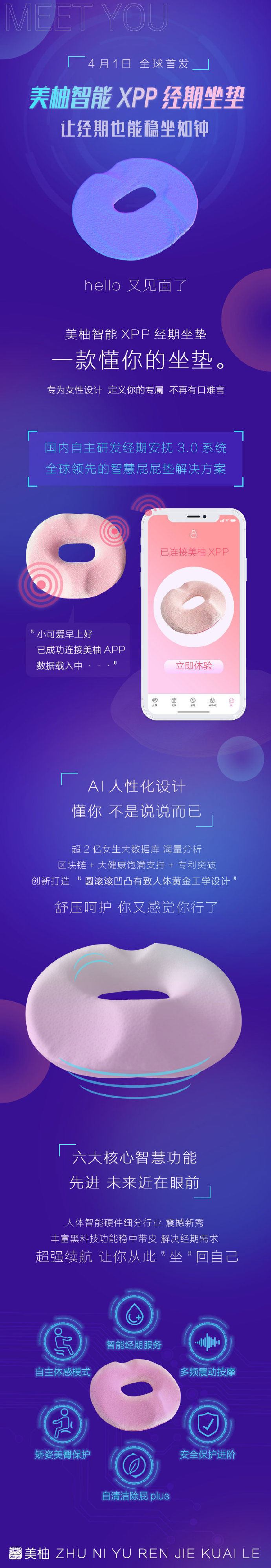 美柚YUREN系列AI家族又添一員——美柚黑科技經(jīng)期坐墊。全球領(lǐng)先的智慧屁屁墊解決方案,經(jīng)期安撫、懶人美臀、自清潔除屁plus等六大功能,讓你坐下